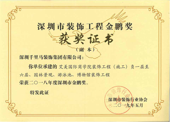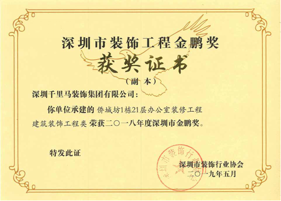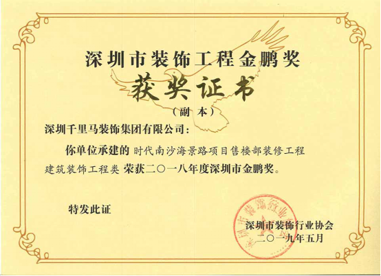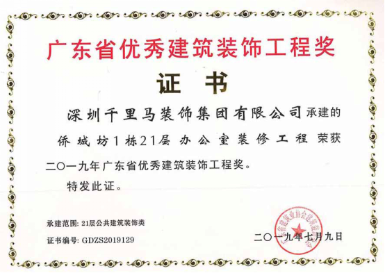 我司承建的僑城坊1棟21層辦公室裝修工程、時代南沙海景路項目售樓部裝修工程、艾美國際商學(xué)院裝飾工程三項目,經(jīng)深圳市裝飾行業(yè)協(xié)會的專家組嚴格審核,均獲得了2018年度深圳市裝飾工程“金鵬獎”。其中,僑城坊1棟21層辦公室裝修工程,經(jīng)廣東省建筑業(yè)協(xié)會組織的專家組嚴格審核,榮獲了2019年廣東省優(yōu)秀建筑裝飾工程獎。